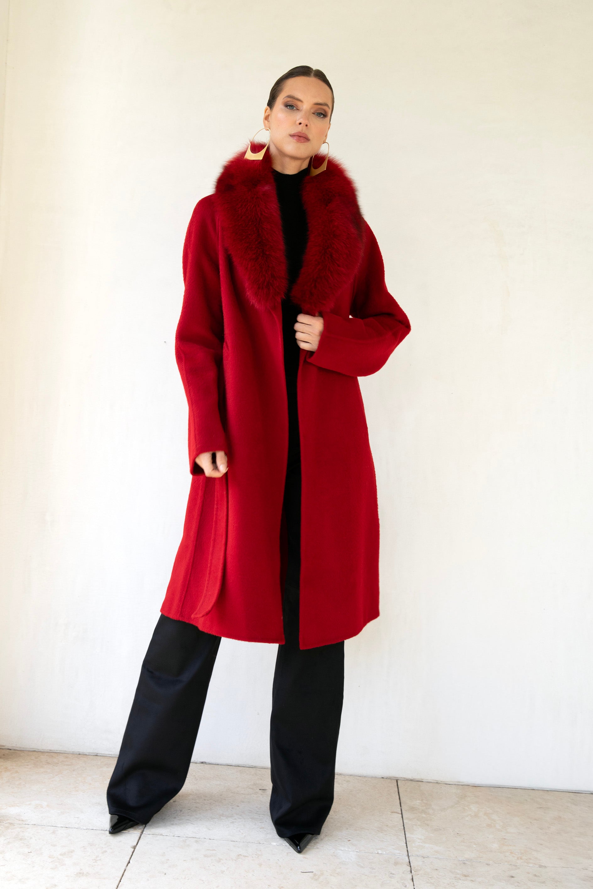 This longline coat is crafted from 100% premium wool and finished with a plush shaved fox fur collar, delivering warmth, drama, and undeniable presence in equal measure.